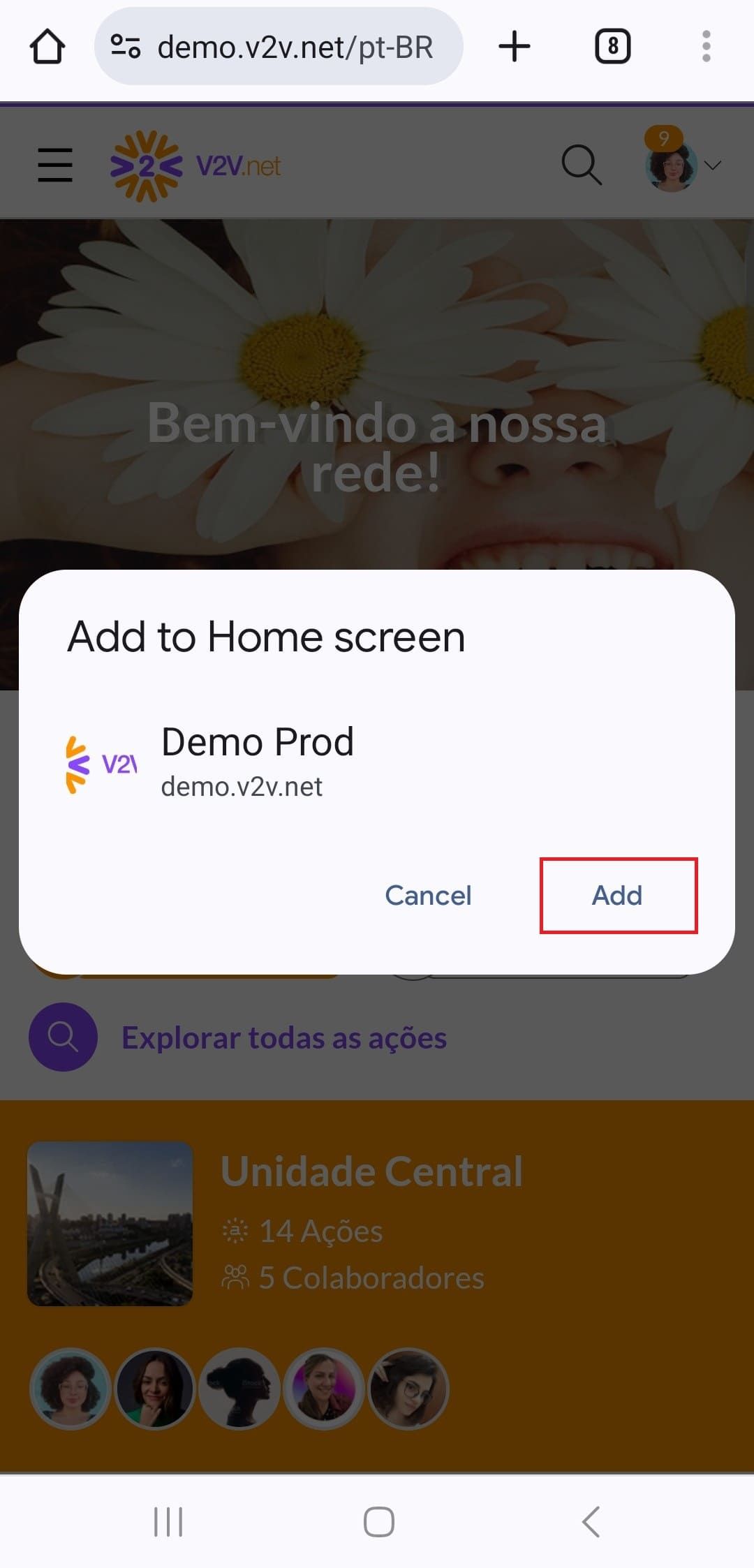 3. Adicione à tela, clicando em "Add" ou “Adicionar”. Dependendo do modelo do seu dispositivo móvel, será necessário digitar o título da página que ficará na tela inicial do seu aplicativo.