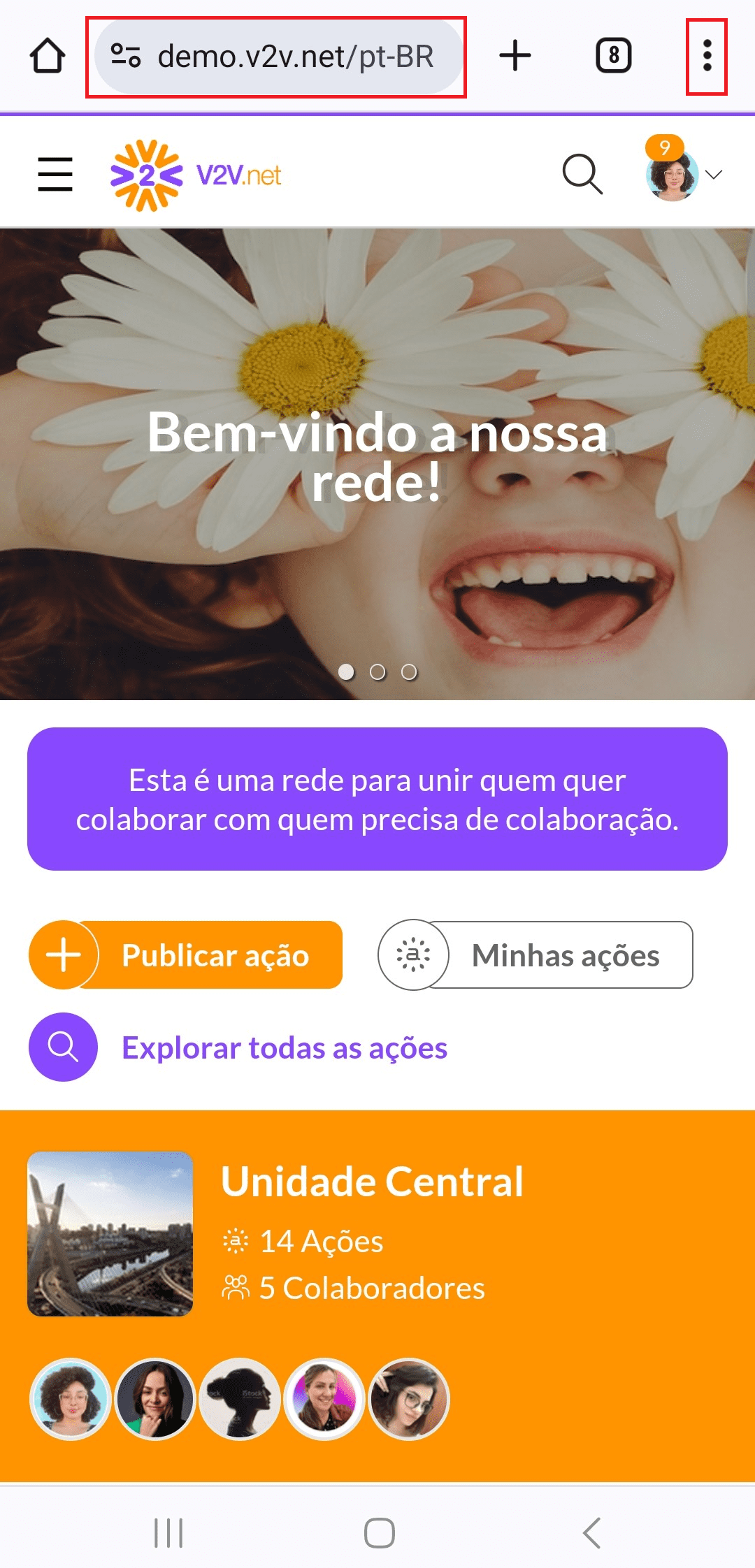 1. Acesse o navegador do seu dispositivo móvel e entre no Portal de Voluntariado da sua empresa: